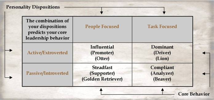 We can see this in Jesus by referencing some modern day leadership concepts and comparing them to his life. For example, consider the four leadership styles usually referred to as Dominant, Influential, Steadfast, and Conscientious — sometimes referred to as the Lion, the Otter, the Golden Retriever, and the Beaver, or as the Driver, the Promoter, the Supporter, and the Analyzer.